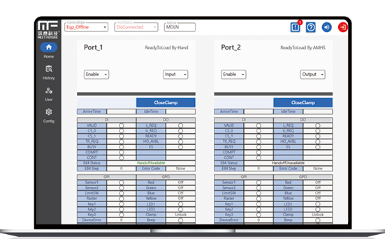 Load Port Station 配合OHT通过E84通讯,进行FOUP上下料,并能够与上层系统MCS/EAP进行事件沟通。